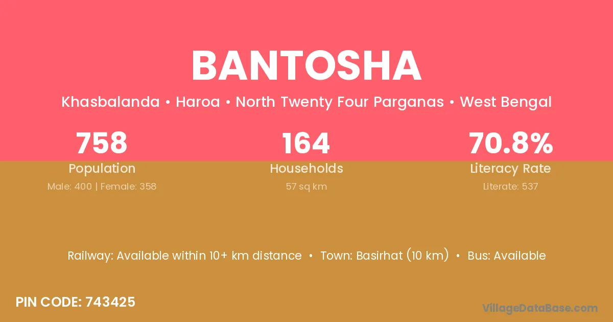 Basirhat (10 km) is the nearest town to Bantosha village for major economic activities and is located approximately 10 km away.