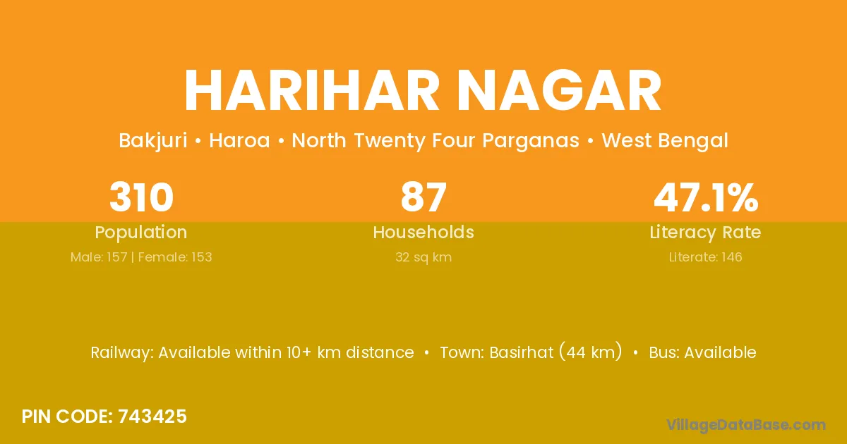 Basirhat (44 km) is the nearest town to Harihar Nagar village for major economic activities and is located approximately 44 km away.