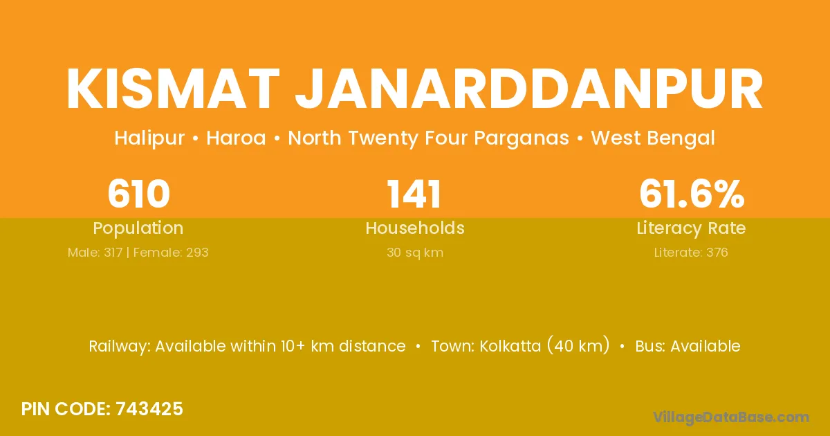 Kolkatta (40 km) is the nearest town to Kismat Janarddanpur village for major economic activities and is located approximately 40 km away.