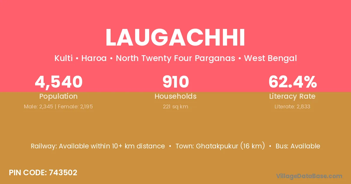 Ghatakpukur (16 km) is the nearest town to Laugachhi village for major economic activities and is located approximately 16 km away.