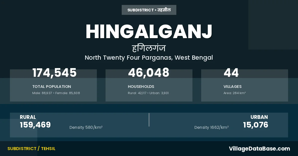 According to the 2011 census The total area of Hingalganj Subdivision is 284 km², with a population of 174545 people. The population density is 615 inhabitants per square kilometre, and there are approximately 46048 houses in the sub district.