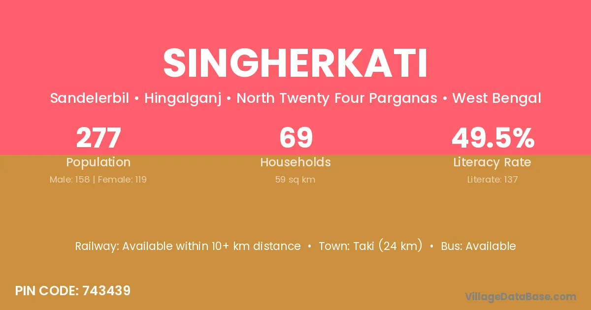 Singherkati village is located in the Hingalganj Subdivision of the North Twenty Four Parganas district in West Bengal.