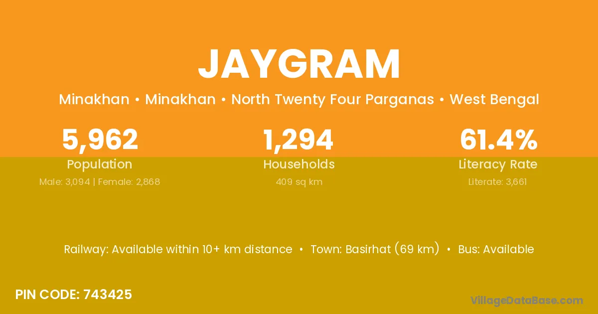 Jaygram village is located in the Minakhan Subdivision of the North Twenty Four Parganas district in West Bengal.