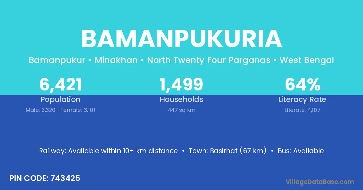 Bamanpukuria village is located in the Minakhan Subdivision of the North Twenty Four Parganas district in West Bengal.