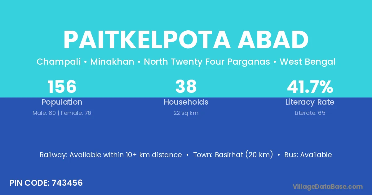 Basirhat (20 km) is the nearest town to Paitkelpota Abad village for major economic activities and is located approximately 20 km away.