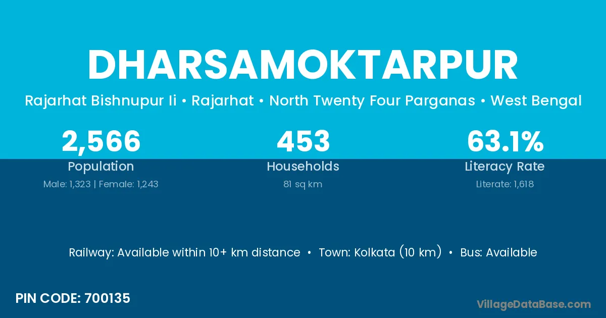 Kolkata (10 km) is the nearest town to Dharsamoktarpur village for major economic activities and is located approximately 10 km away.