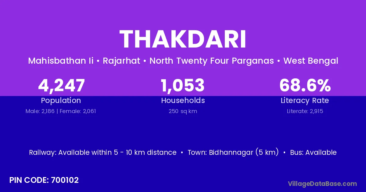 Bidhannagar (5 km) is the nearest town to Thakdari village for major economic activities and is located approximately 5 km away.