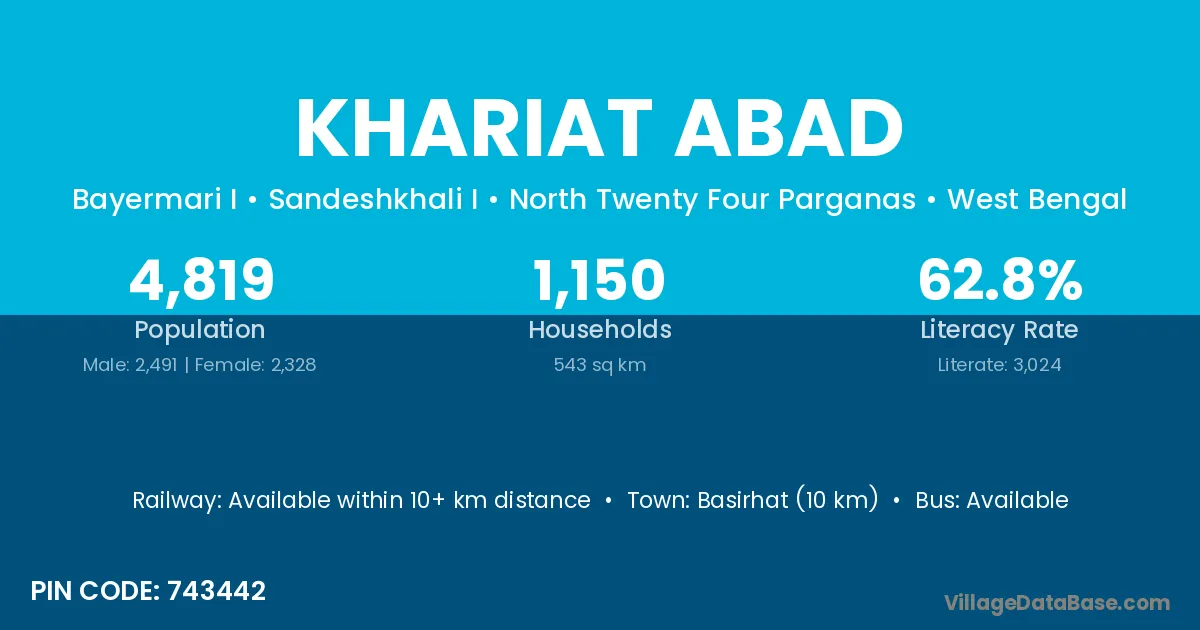 Basirhat (10 km) is the nearest town to Khariat Abad village for major economic activities and is located approximately 10 km away.