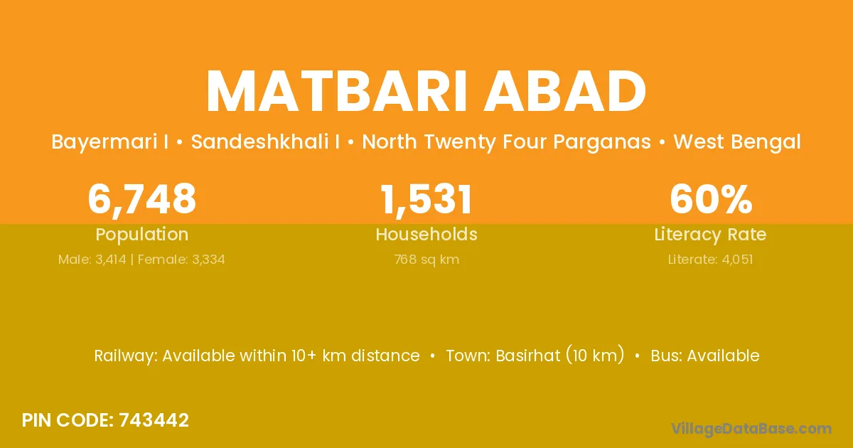 Basirhat (10 km) is the nearest town to Matbari Abad village for major economic activities and is located approximately 10 km away.