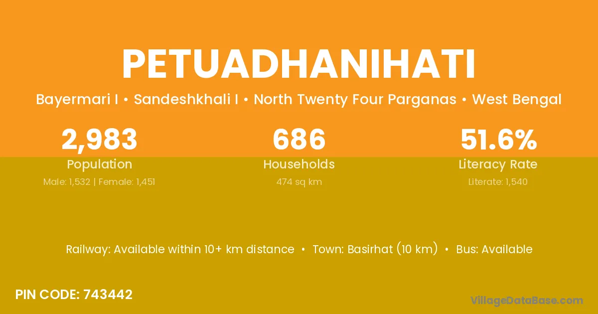 Basirhat (10 km) is the nearest town to Petuadhanihati village for major economic activities and is located approximately 10 km away.