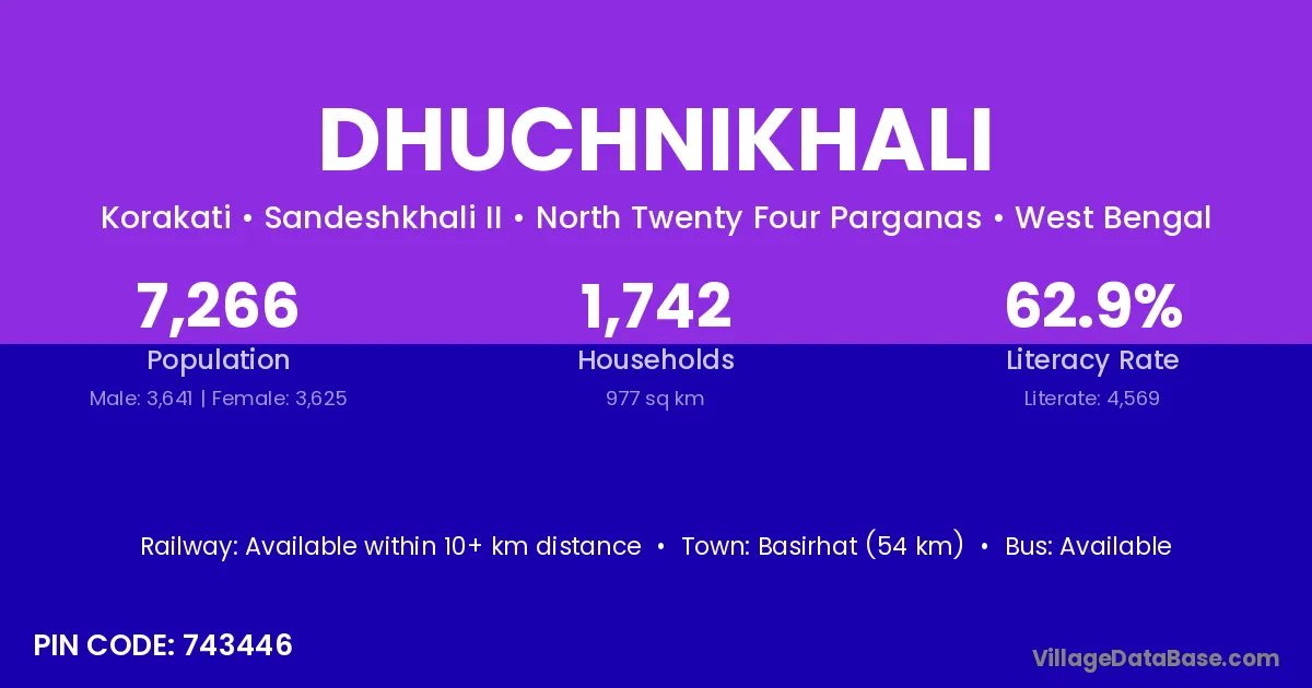 Basirhat (54 km) is the nearest town to Dhuchnikhali village for major economic activities and is located approximately 54 km away.
