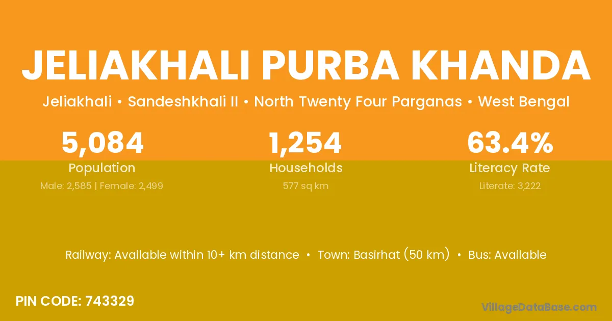 Jeliakhali Purba Khanda village has a total population of 5,084 people, of which 2,585 are males and 2,499 are females.