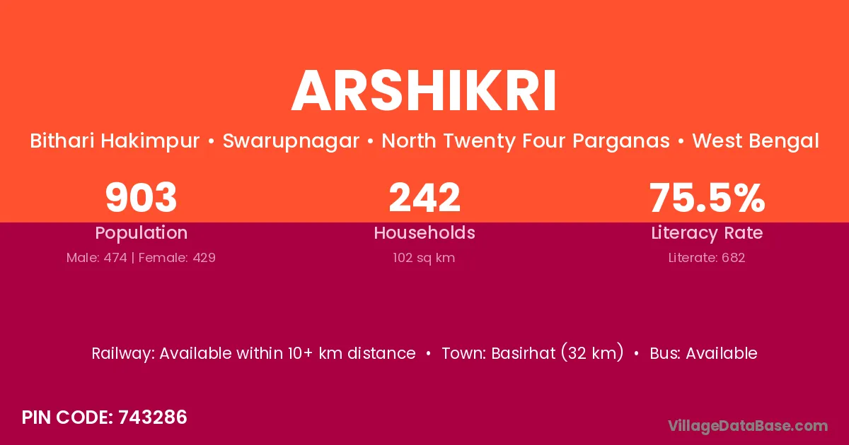 Basirhat (32 km) is the nearest town to Arshikri village for major economic activities and is located approximately 32 km away.