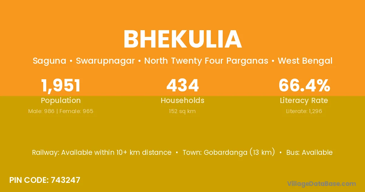 Gobardanga (13 km) is the nearest town to Bhekulia village for major economic activities and is located approximately 13 km away.