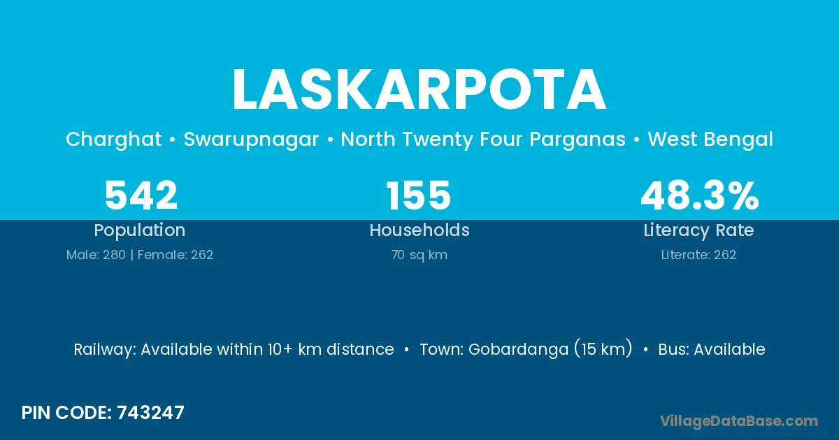 Gobardanga (15 km) is the nearest town to Laskarpota village for major economic activities and is located approximately 15 km away.