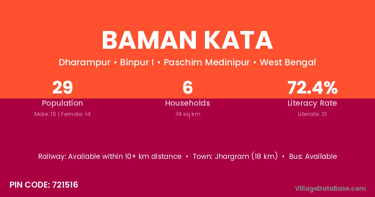 Jhargram (18 km) is the nearest town to Baman Kata village for major economic activities and is located approximately 18 km away.