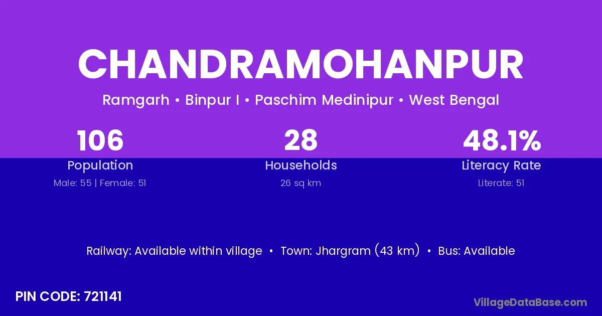 Jhargram (43 km) is the nearest town to Chandramohanpur village for major economic activities and is located approximately 43 km away.