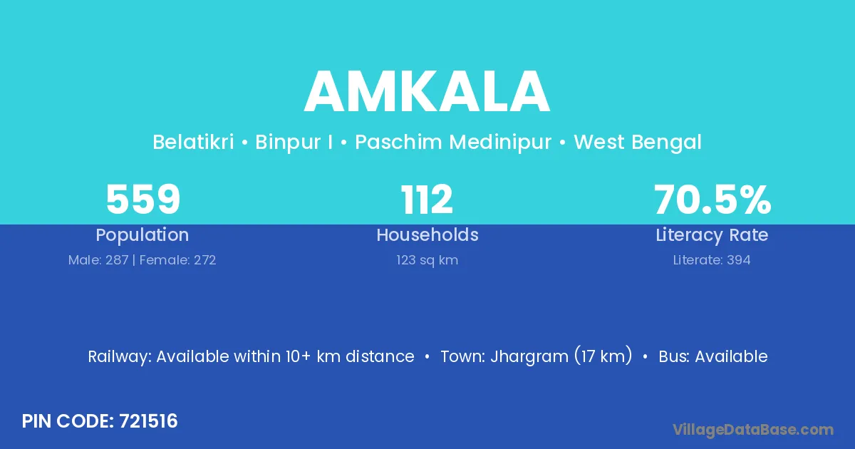 Jhargram (17 km) is the nearest town to Amkala village for major economic activities and is located approximately 17 km away.