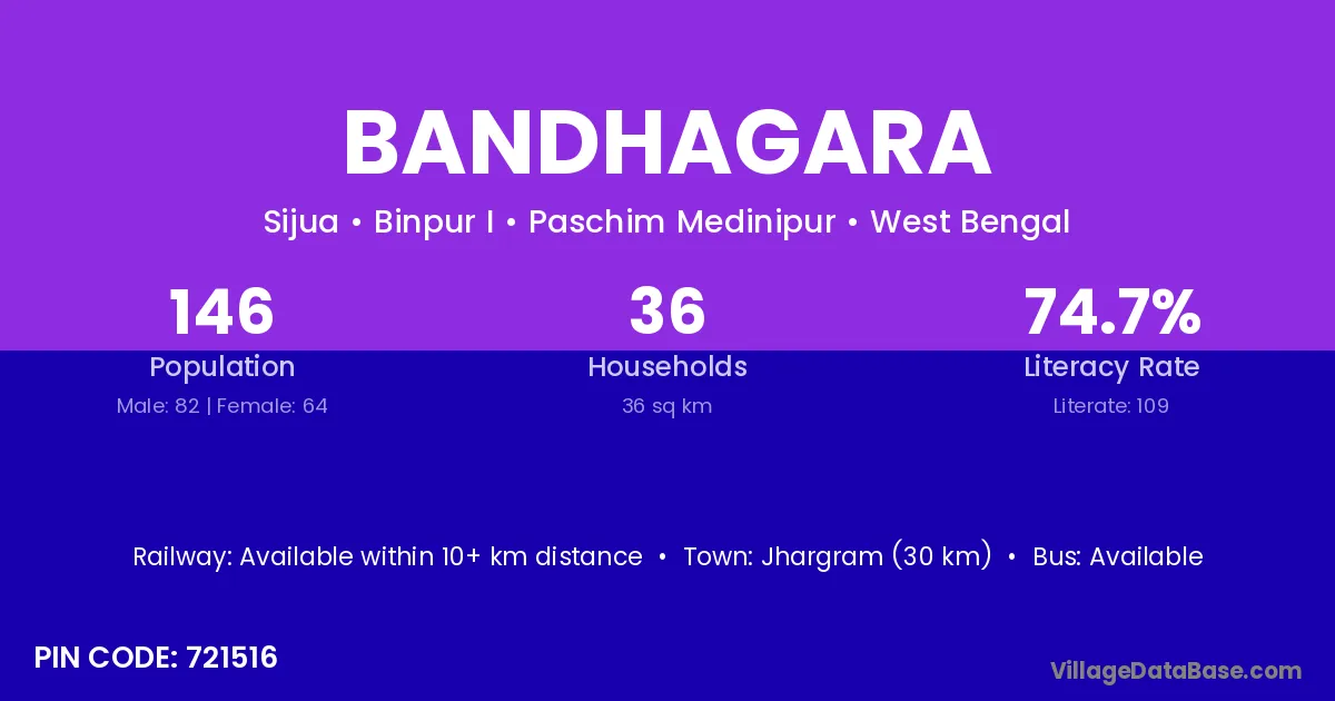 Jhargram (30 km) is the nearest town to Bandhagara village for major economic activities and is located approximately 30 km away.