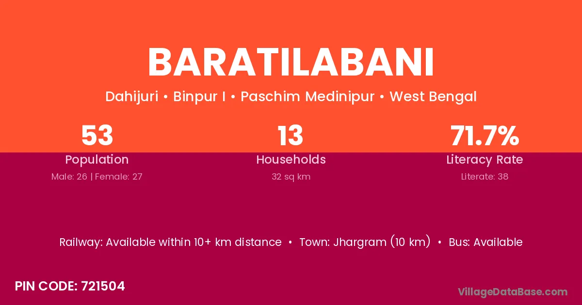 Jhargram (10 km) is the nearest town to Baratilabani village for major economic activities and is located approximately 10 km away.