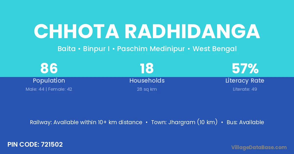 Jhargram (10 km) is the nearest town to Chhota Radhidanga village for major economic activities and is located approximately 10 km away.