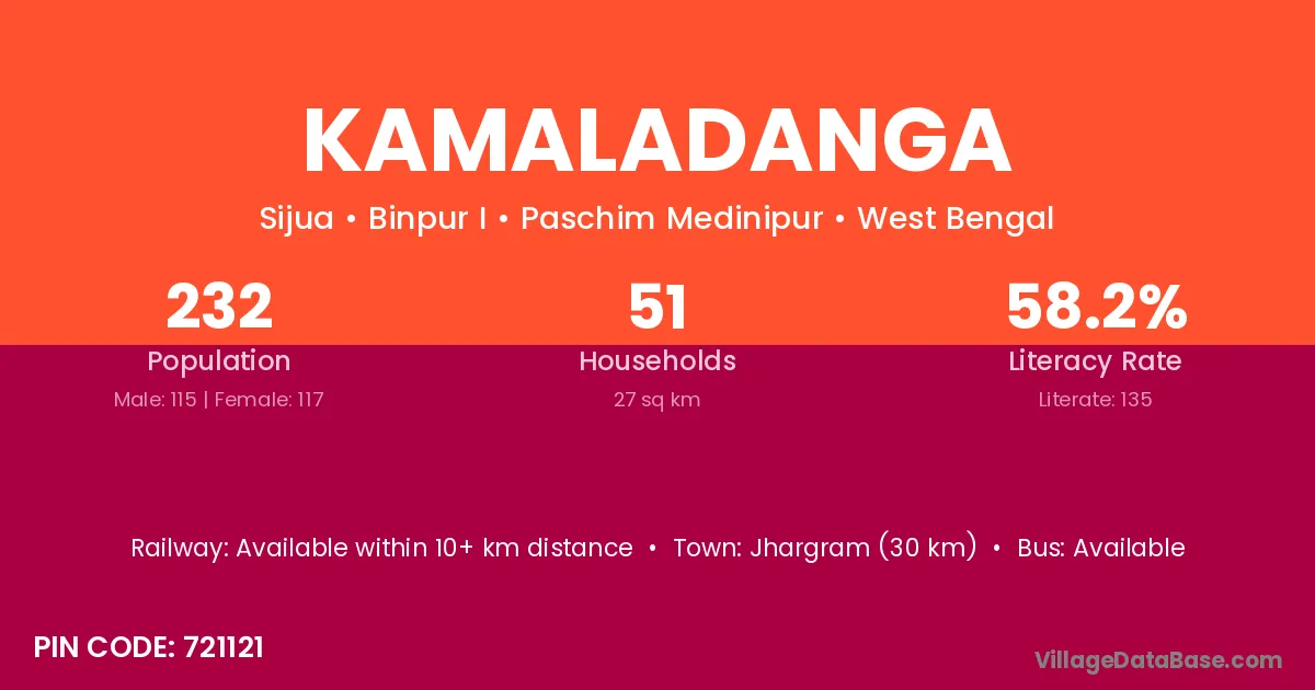 Jhargram (30 km) is the nearest town to Kamaladanga village for major economic activities and is located approximately 30 km away.