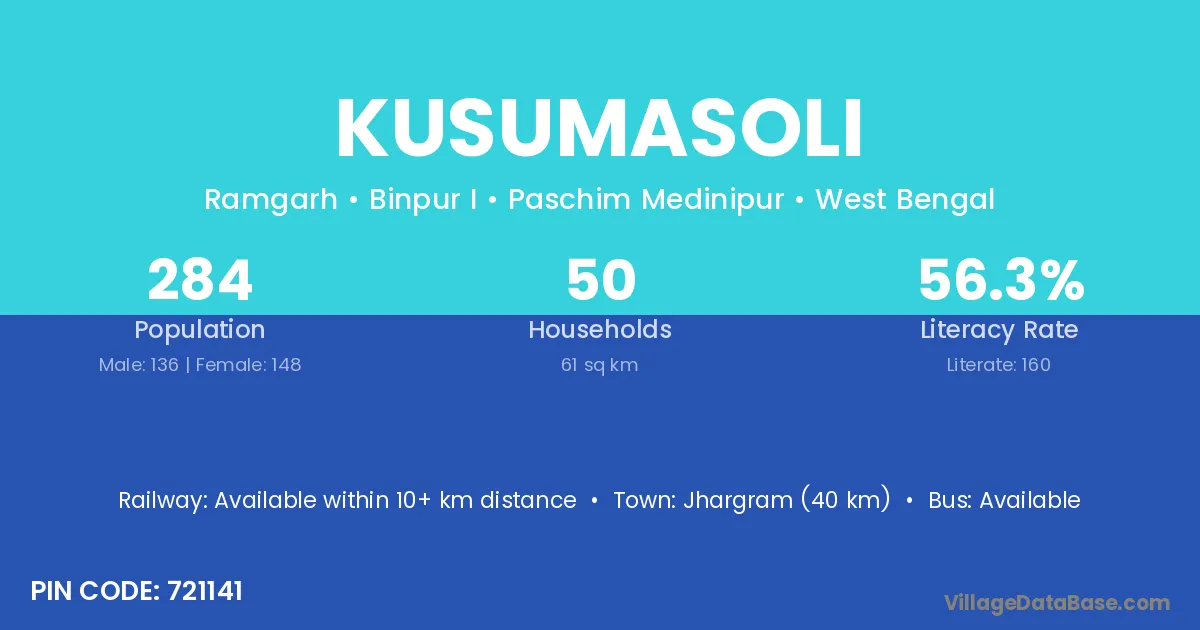 Jhargram (40 km) is the nearest town to Kusumasoli village for major economic activities and is located approximately 40 km away.