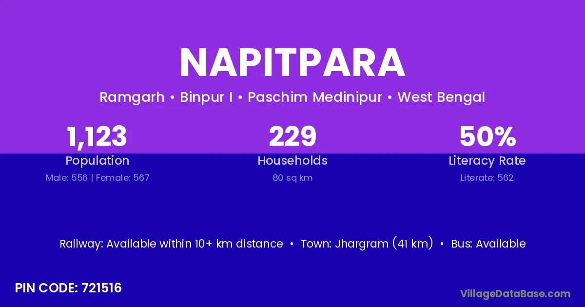Jhargram (41 km) is the nearest town to Napitpara village for major economic activities and is located approximately 41 km away.