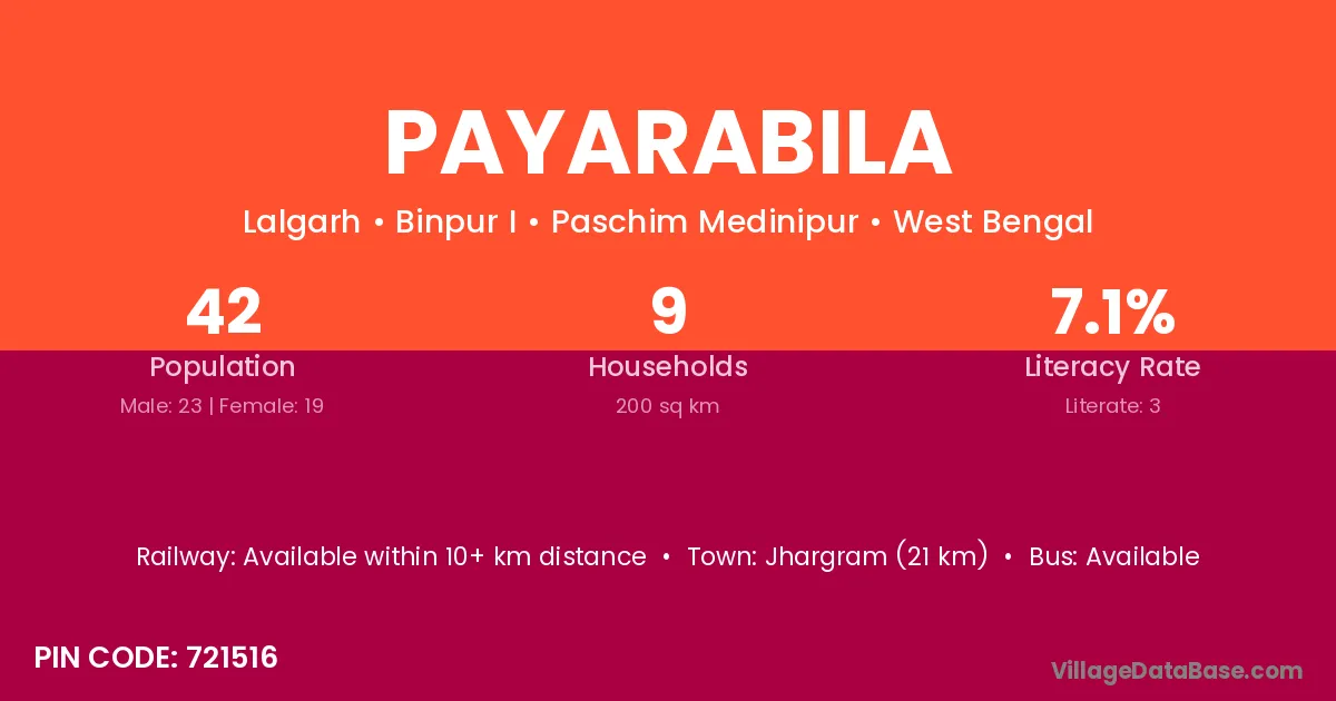 Jhargram (21 km) is the nearest town to Payarabila village for major economic activities and is located approximately 21 km away.
