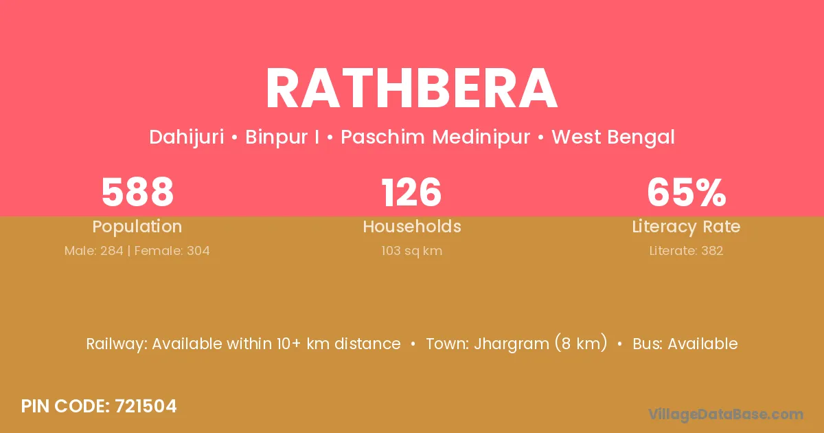 Jhargram (8 km) is the nearest town to Rathbera village for major economic activities and is located approximately 8 km away.