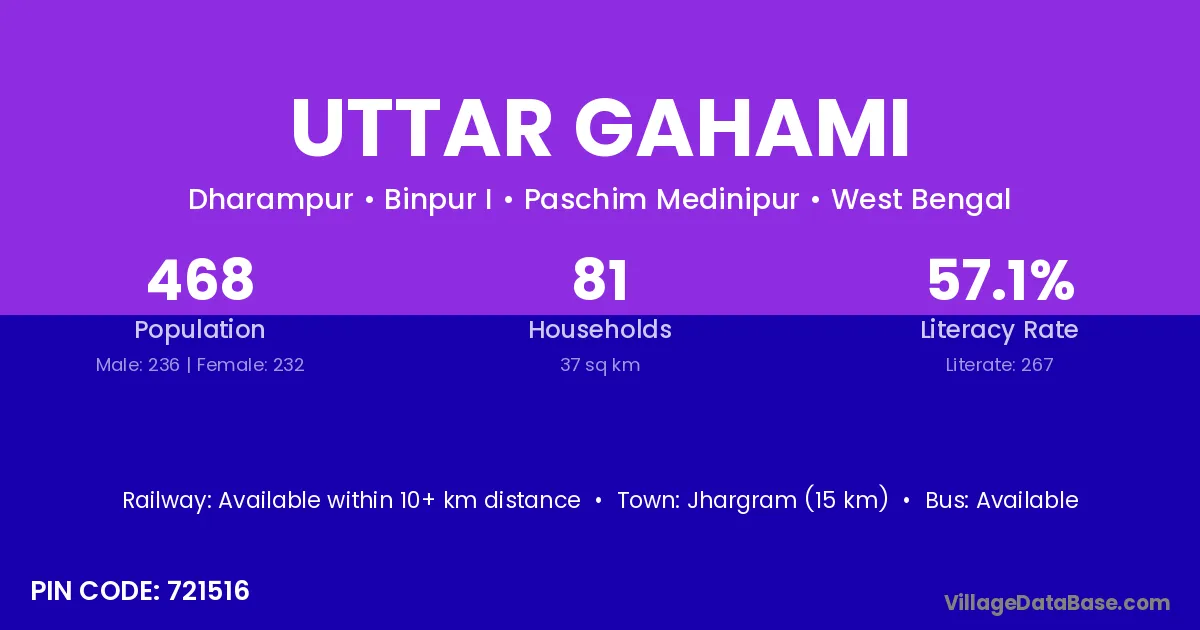 Jhargram (15 km) is the nearest town to Uttar Gahami village for major economic activities and is located approximately 15 km away.
