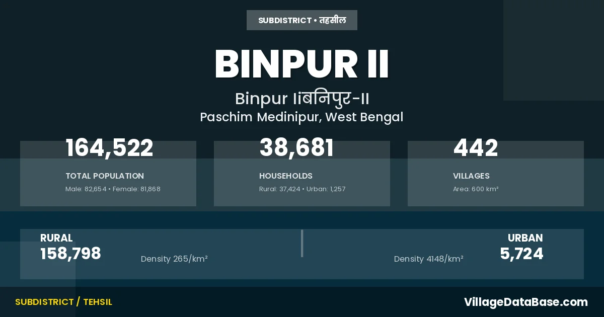 According to the 2011 census The total area of Binpur II Subdivision is 600 km², with a population of 164522 people. The population density is 274 inhabitants per square kilometre, and there are approximately 38681 houses in the sub district.