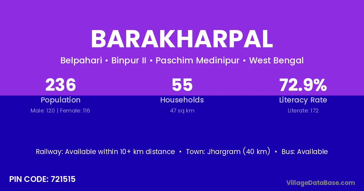 Jhargram (40 km) is the nearest town to Barakharpal village for major economic activities and is located approximately 40 km away.