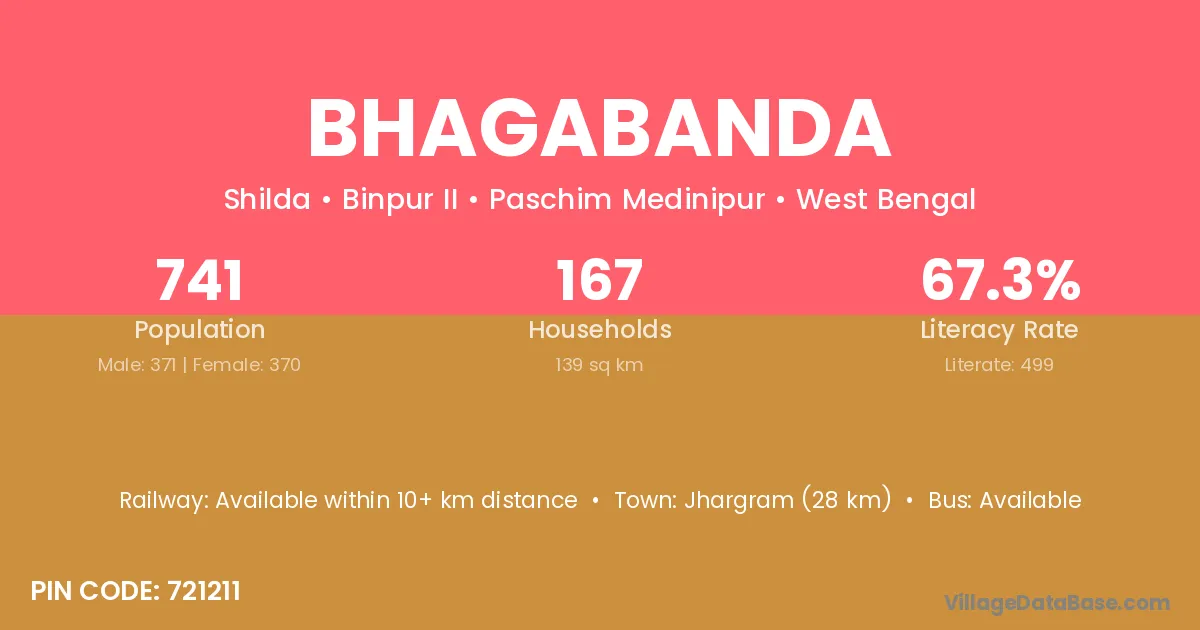 Jhargram (28 km) is the nearest town to Bhagabanda village for major economic activities and is located approximately 28 km away.