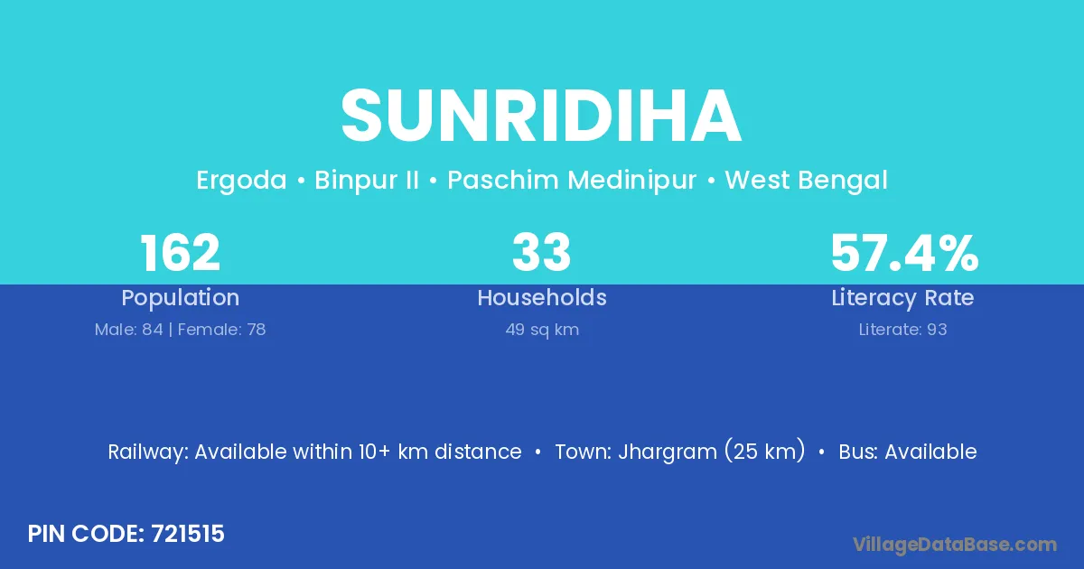 Jhargram (25 km) is the nearest town to Sunridiha village for major economic activities and is located approximately 25 km away.