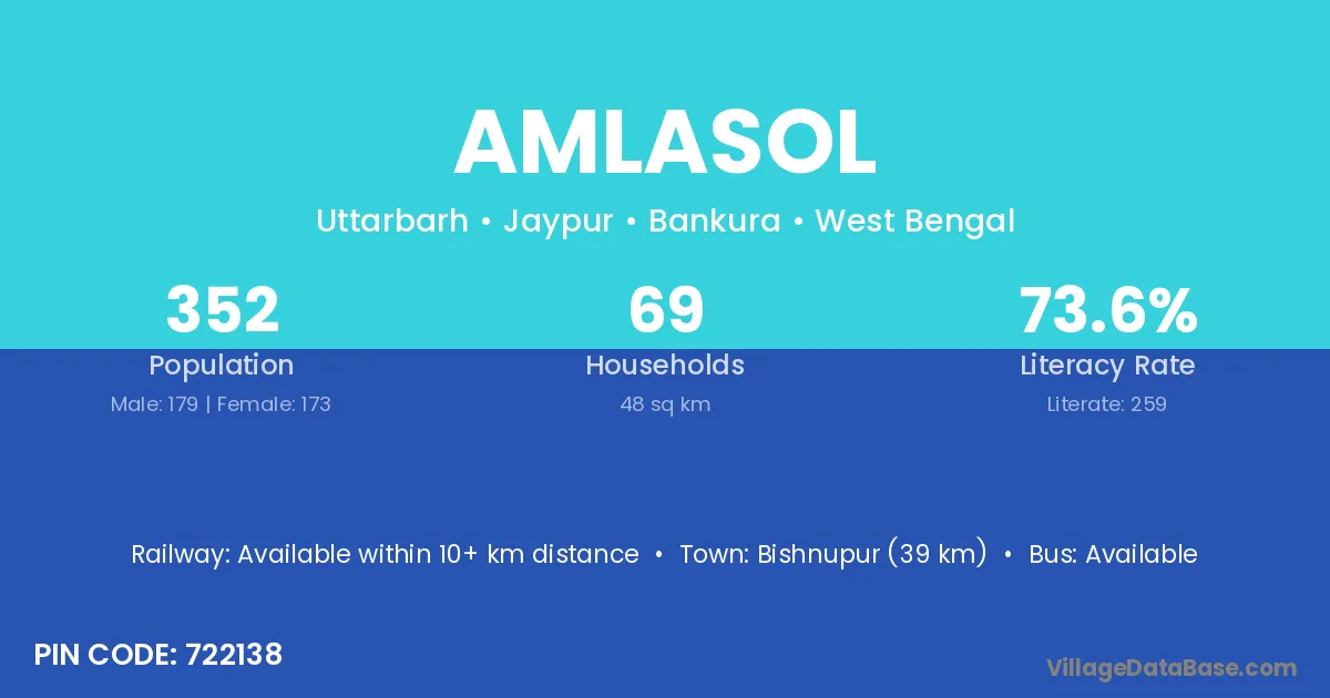Jhargram (69 km) is the nearest town to Amlasol village for major economic activities and is located approximately 69 km away.