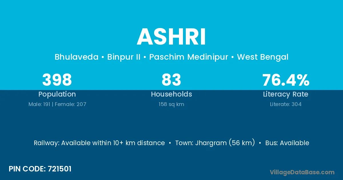 Jhargram (56 km) is the nearest town to Ashri village for major economic activities and is located approximately 56 km away.
