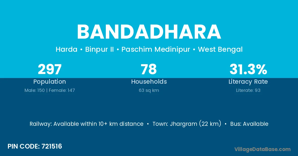 Jhargram (22 km) is the nearest town to Bandadhara village for major economic activities and is located approximately 22 km away.