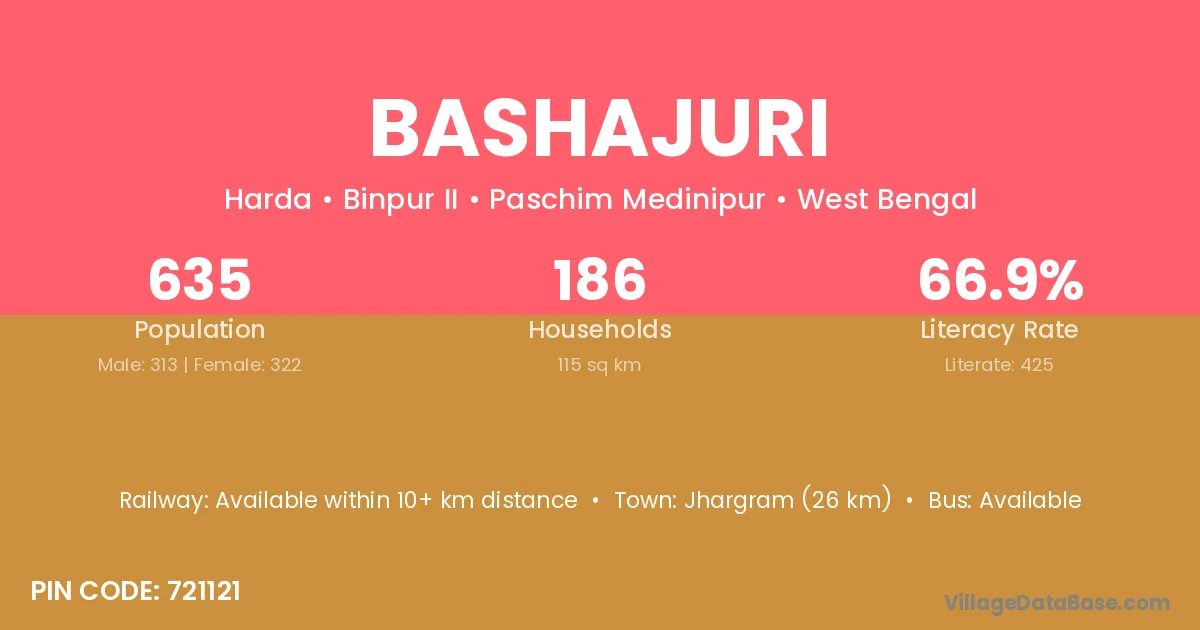 Jhargram (26 km) is the nearest town to Bashajuri village for major economic activities and is located approximately 26 km away.