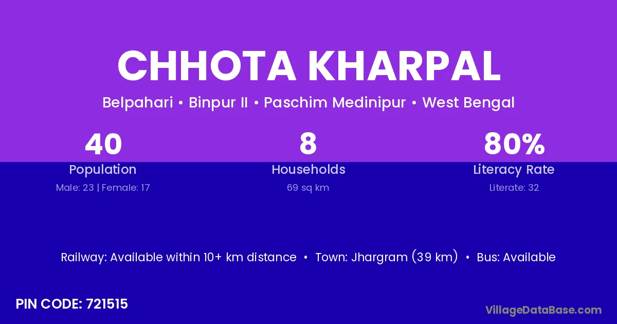 Jhargram (39 km) is the nearest town to Chhota Kharpal village for major economic activities and is located approximately 39 km away.