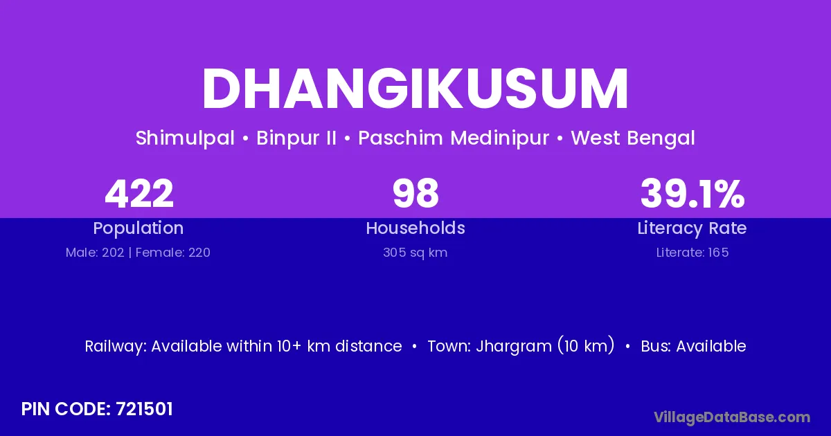 Jhargram (10 km) is the nearest town to Dhangikusum village for major economic activities and is located approximately 10 km away.