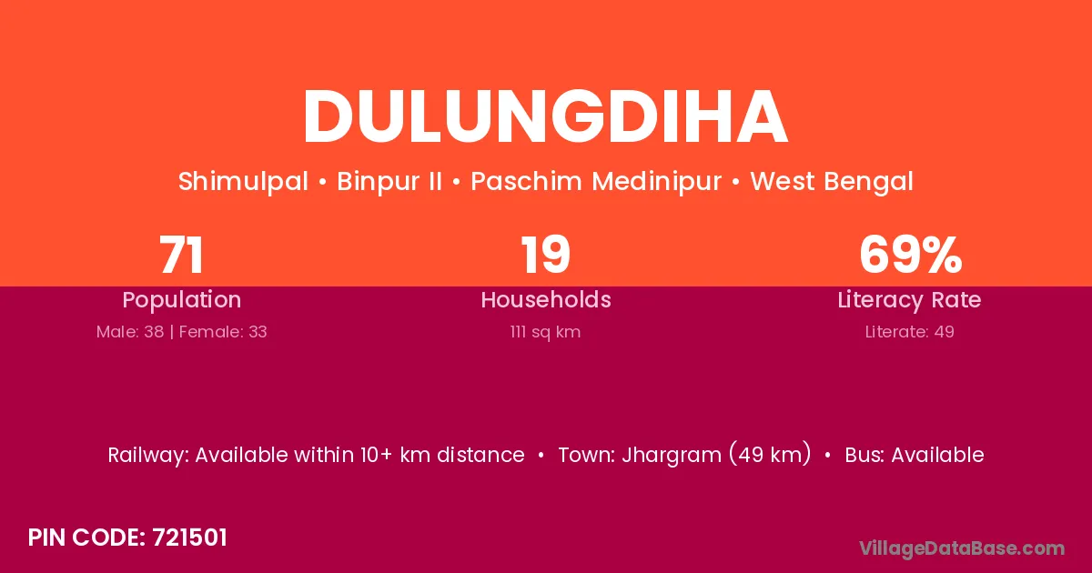 Jhargram (49 km) is the nearest town to Dulungdiha village for major economic activities and is located approximately 49 km away.