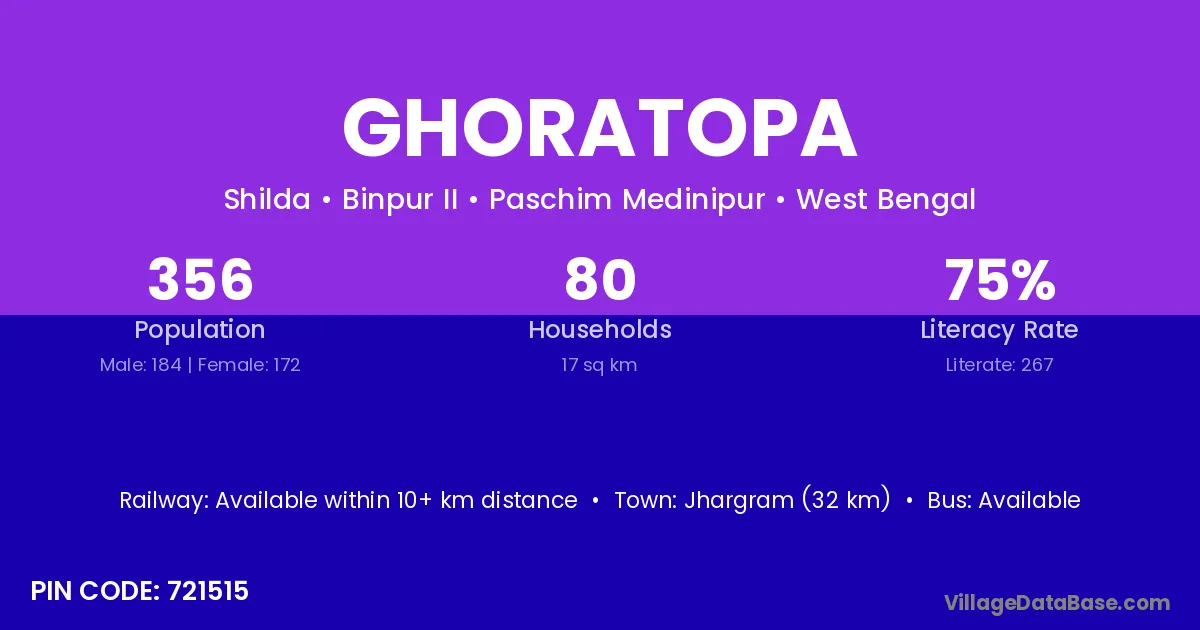 Jhargram (32 km) is the nearest town to Ghoratopa village for major economic activities and is located approximately 32 km away.