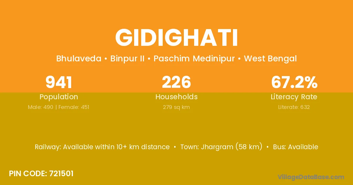 Jhargram (58 km) is the nearest town to Gidighati village for major economic activities and is located approximately 58 km away.