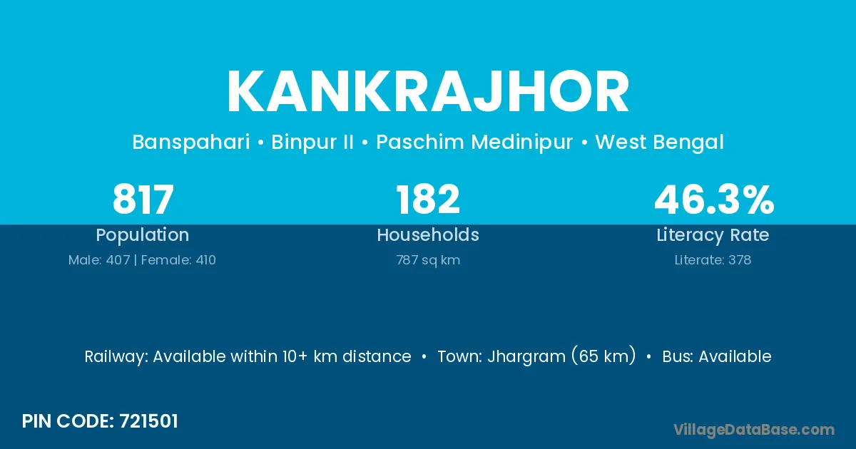 Jhargram (65 km) is the nearest town to Kankrajhor village for major economic activities and is located approximately 65 km away.