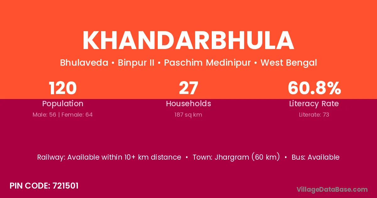 Jhargram (60 km) is the nearest town to Khandarbhula village for major economic activities and is located approximately 60 km away.