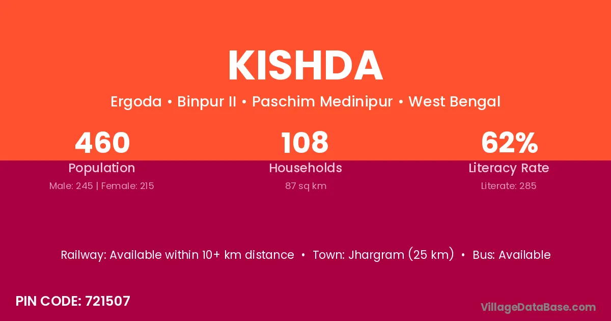 Jhargram (25 km) is the nearest town to Kishda village for major economic activities and is located approximately 25 km away.
