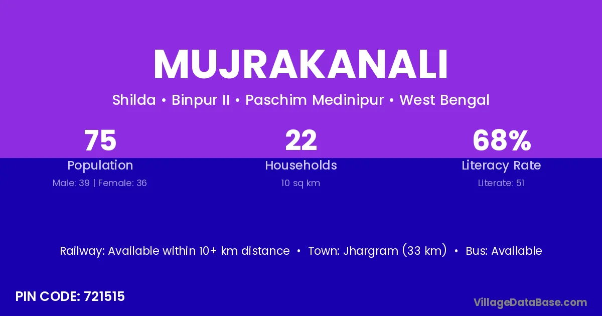 Jhargram (33 km) is the nearest town to Mujrakanali village for major economic activities and is located approximately 33 km away.
