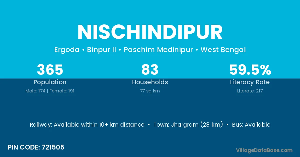 Jhargram (28 km) is the nearest town to Nischindipur village for major economic activities and is located approximately 28 km away.