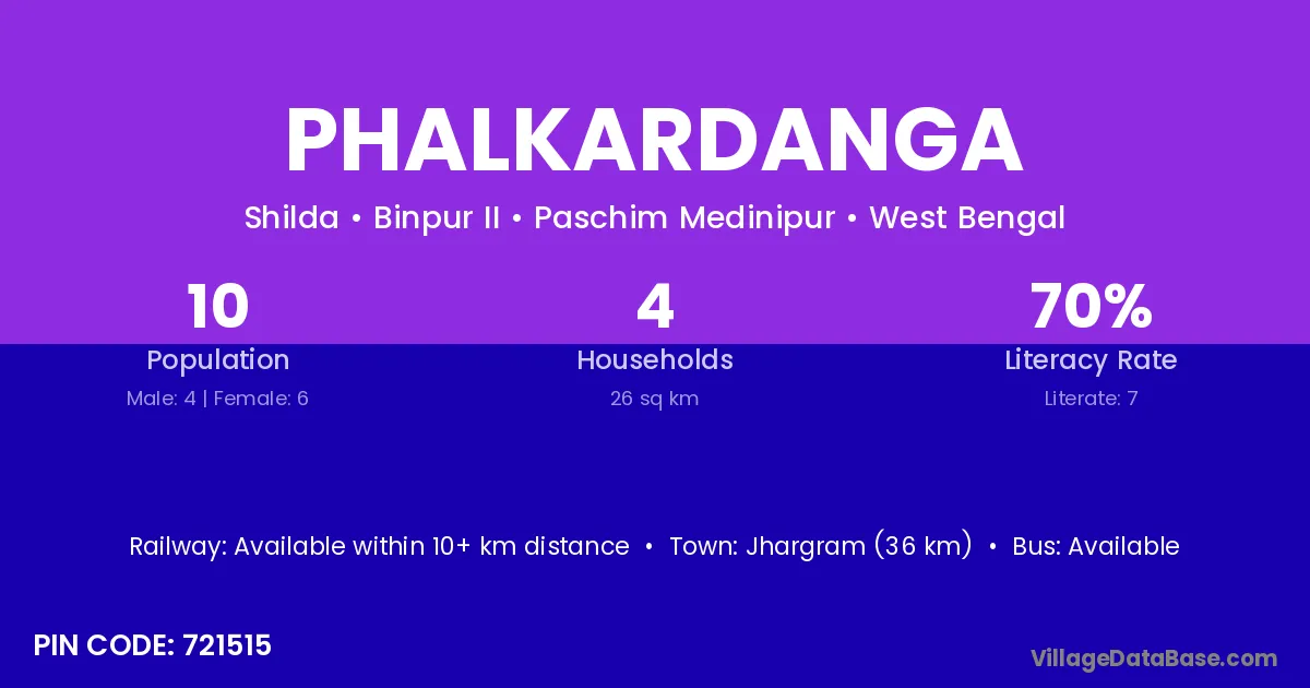 Jhargram (36 km) is the nearest town to Phalkardanga village for major economic activities and is located approximately 36 km away.